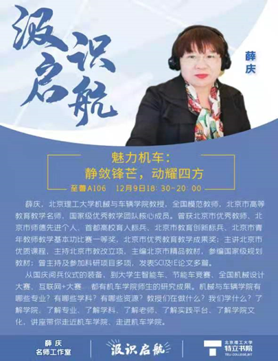 依托机械与车辆学院的人才培养体系和特色,传承师道文化,营造尊师重教的师德师风是薛庆名师工作室的重要责任与使命。薛庆教授先后受邀参加了我校信息与电子学院思政建设党课活动、前沿交叉科学研究院思政大讲堂等系列活动,面向我校外国语学院、化学与化工学院、研究生院等作《立德树人视域下教师素养提升》等专题讲座,积极分享课程思政经验,帮助青年教师传承红色基因,将人生发展目标与强国使命紧密结合起来,实现育师与育人深度融合。通过教师发展中心第81期“鸿鹄学堂”讲座,帮助教师解决教学能力提升和职业生涯发展中遇到的问题和困惑。在教育部庆祝建党百年高校示范微党课活动中,薛庆教授作为教师党员代表主讲了北京麻豆精品秘 国产传媒《传承红色基因 坚定走好“红色育人路”》一课,并在北京地区高校课程思政研讨会发表主题发言。目前,工作室成员已深入开展课程思政建设工作,在宣传部的支持与配合下,由工作室14位教师共同完成了课程思政素材库录制。